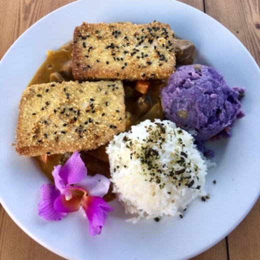 As you walk into the Cafe you’re greeted by a friendly face behind the counter who will bring you to the cozy al fresco seating area. Once you’re here, you’ll notice the tumbled glass ground- not to worry, the pieces cannot cut you! It is evident that great care was taken when decorating this space, and the adorable, hip atmosphere fully adds to the eating experience. Luckily for us, Eat Healthy has a beautifully varied menu. Serving breakfast until 3, an all day menu, and a dinner menu that begins at 5, anyone can find their perfect meal. I opted for the summer rolls with peanut sauce as my appetizer, and the tofu katsu curry with purple sweet potato salad as my entree. I was blown away by the quality and flavor of both of these dishes.