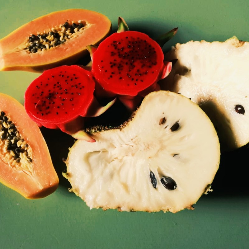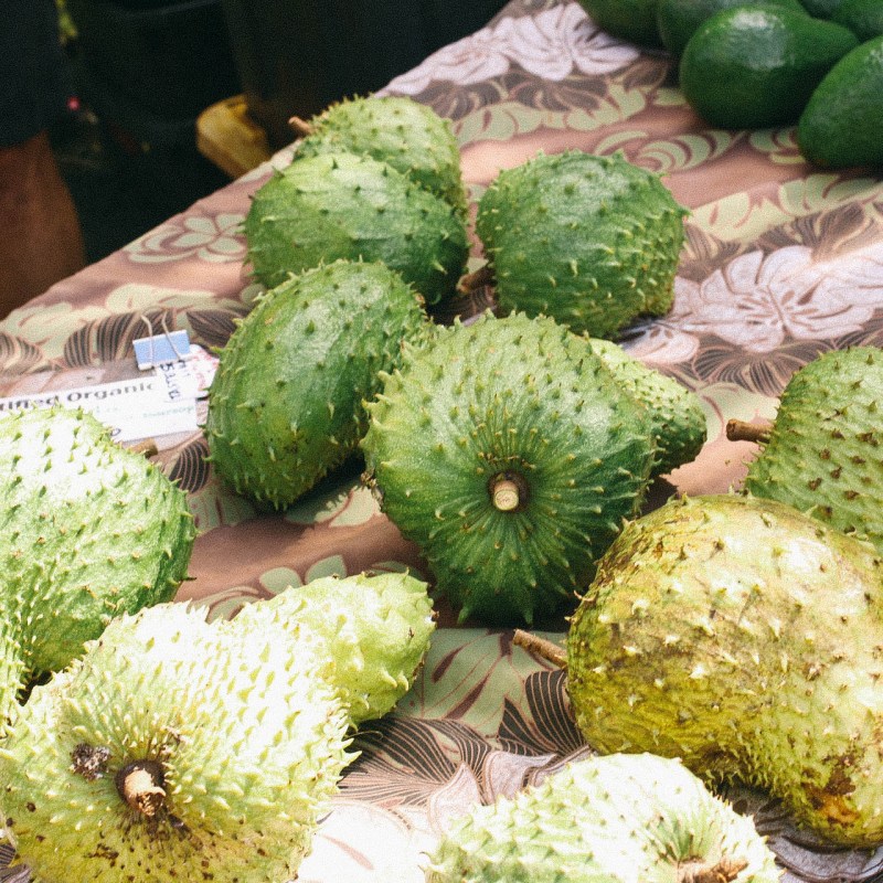 - Soursop -First on the list, and a personal favorite. Also known by the name Graviola, this green spiky fruit is packed with nutrients. Some say it tastes like a combination of banana and pineapple, with citrus back notes. You can slice in half, remove the seeds and use the white soft flesh in smoothies or just eat by the spoonful! It boosts immunity, has cancer fighting properties and is rich in Vitamin C. Our friends at Rising Sun Organic Farm almost always have a beautiful soursop fruit for you to try.